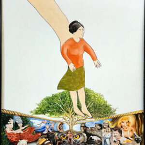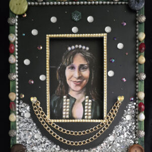 on wood, digital print, chain, buttons, gems